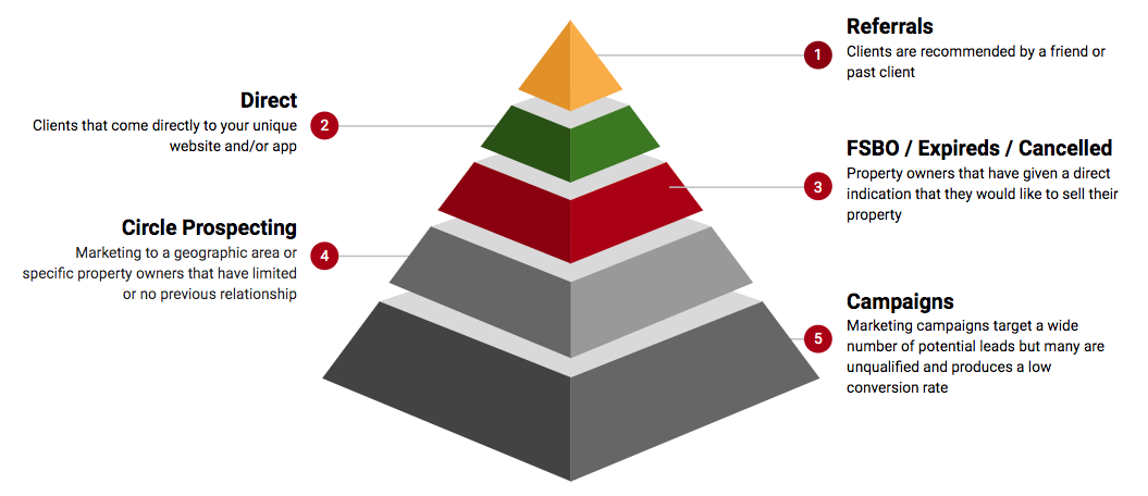 The pyramid above represents the five major pillars of Residential Listing Lead Sources and their respective conversion rates. Referral leads generally have the highest conversion rate. Meaning, a referral lead will likely take less effort overall than other lead sources to get a closed deal.